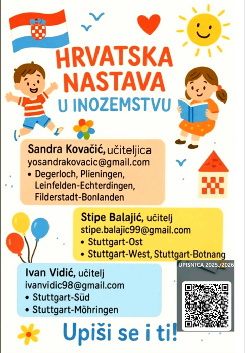 započela je nova školska godina, a s početkom redovne nastave započinje i hrvatska nastava u inozemstvu. Hrvatska nastava nudi djeci mogućnost učenja hrvatskoga jezika, kulture i baštine u hrvatskom govornom okruženju. Hrvatska nastava nije samo mjesto učenja jezika, hrvatska nastava nudi mogućnost sklapanja novih prijateljstava, učenje hrvatskih običaja, pjesama, plesa te Vašem djetetu donosi jedno novo iskustvo ovdje u inozemstvu. Cilj nam je da se hrvatski jezik njeguje i čuje bez obzira na udaljenost od domovine i želimo da djeca očuvaju svoj materinji jezik te kroz učenje uz igru izgrade čvrste temelje na daljnji život, bilo u domovini ili u inozemstvu. Na području Stuttgarta i okolnih mjesta održava se nastava na 43 nastavna mjesta., a na priloženom letku navedeni su kontakti učitelji koji održavaju nastavu na području Stuttgarta.
